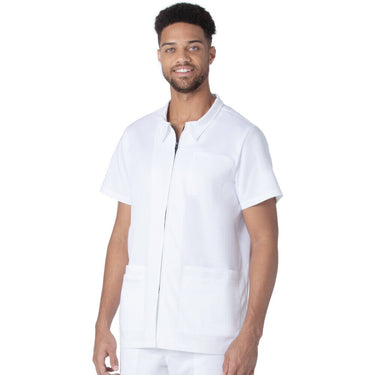 Landau Proflex Men's 6-Pocket Notch Collar Top - WHITE / Sizes S - 5XL. A notched collar and back yoke provide a professional appearance while a zipper closure adds style and convenience to this top. With six pockets, you'll never run out of room for your medical essentials. Landau's modern tailored fit is tapered to enhance your shape without constricting your movement, and Landau's 2-way comfort stretch helps give you added flexibility required of your work wear. Landau isknown for producing apparel that work as hard as you do!