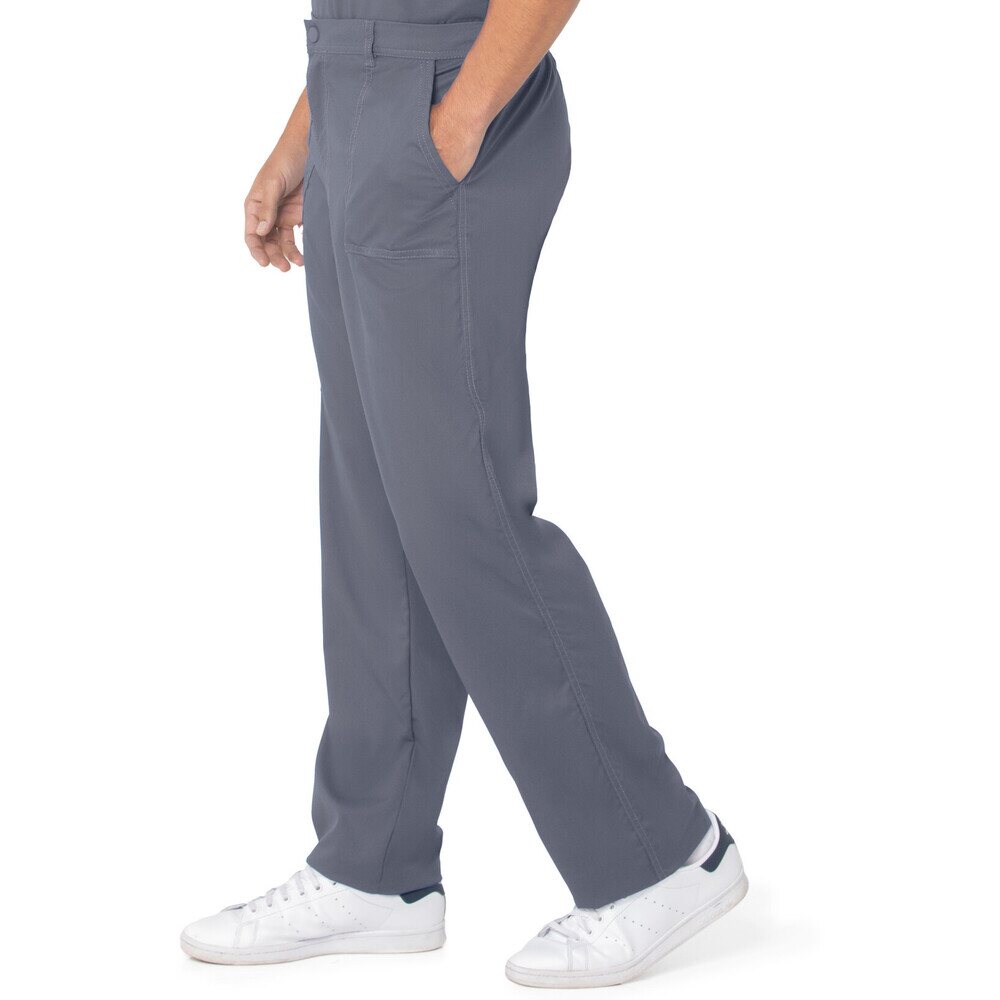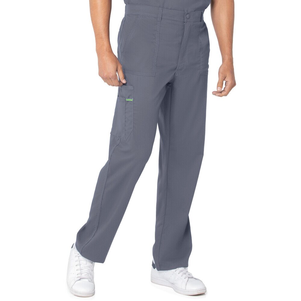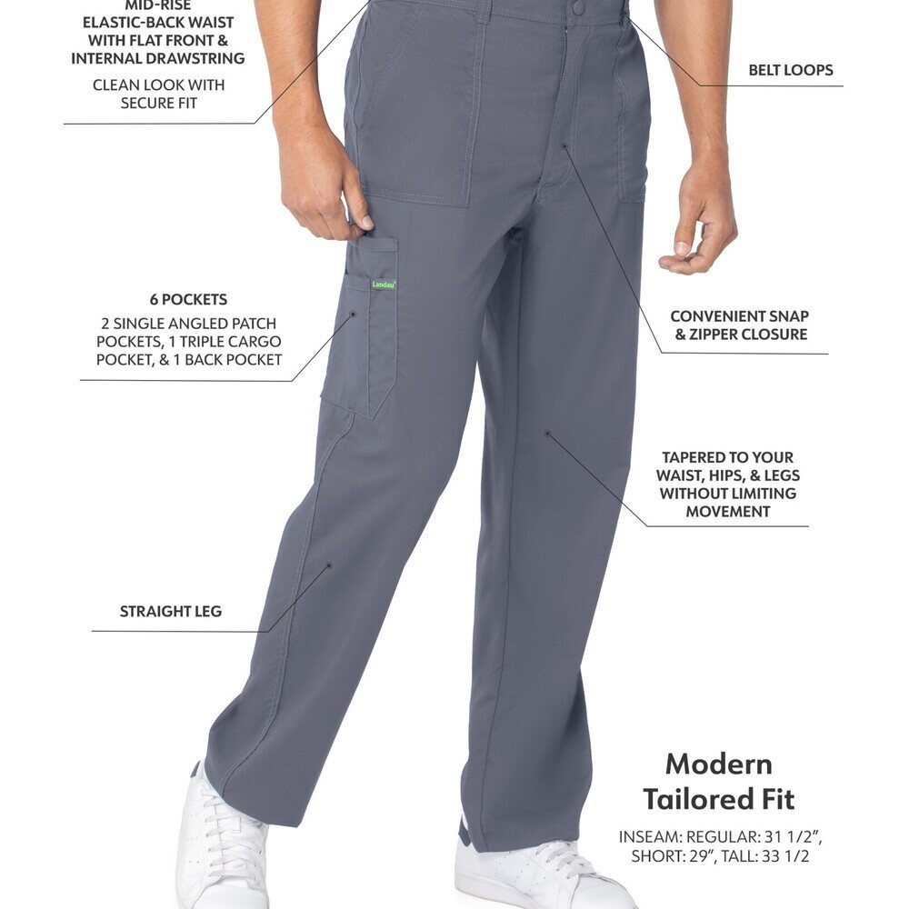 Landau Proflex Men's Straight-Leg Cargo Pants - STEEL / Sizes S - 5XL. These Landau ProFlex cargo pants come fully loaded with an elastic-back waist and flat front with a zipper and snap closure as well as belt loops and an internal drawstring for an adjustable fit. Six pockets offer plenty of storage space for all your medical accessories. Landau's men's modern tailored fit is tapered to enhance your shape without constricting your movement, and Landau's 2-way comfort stretch helps give you added flexibility required of your work wear. Landau is known for producing apparel that work as hard as you do! 73% Polyester/25% Rayon/2% Spandex.