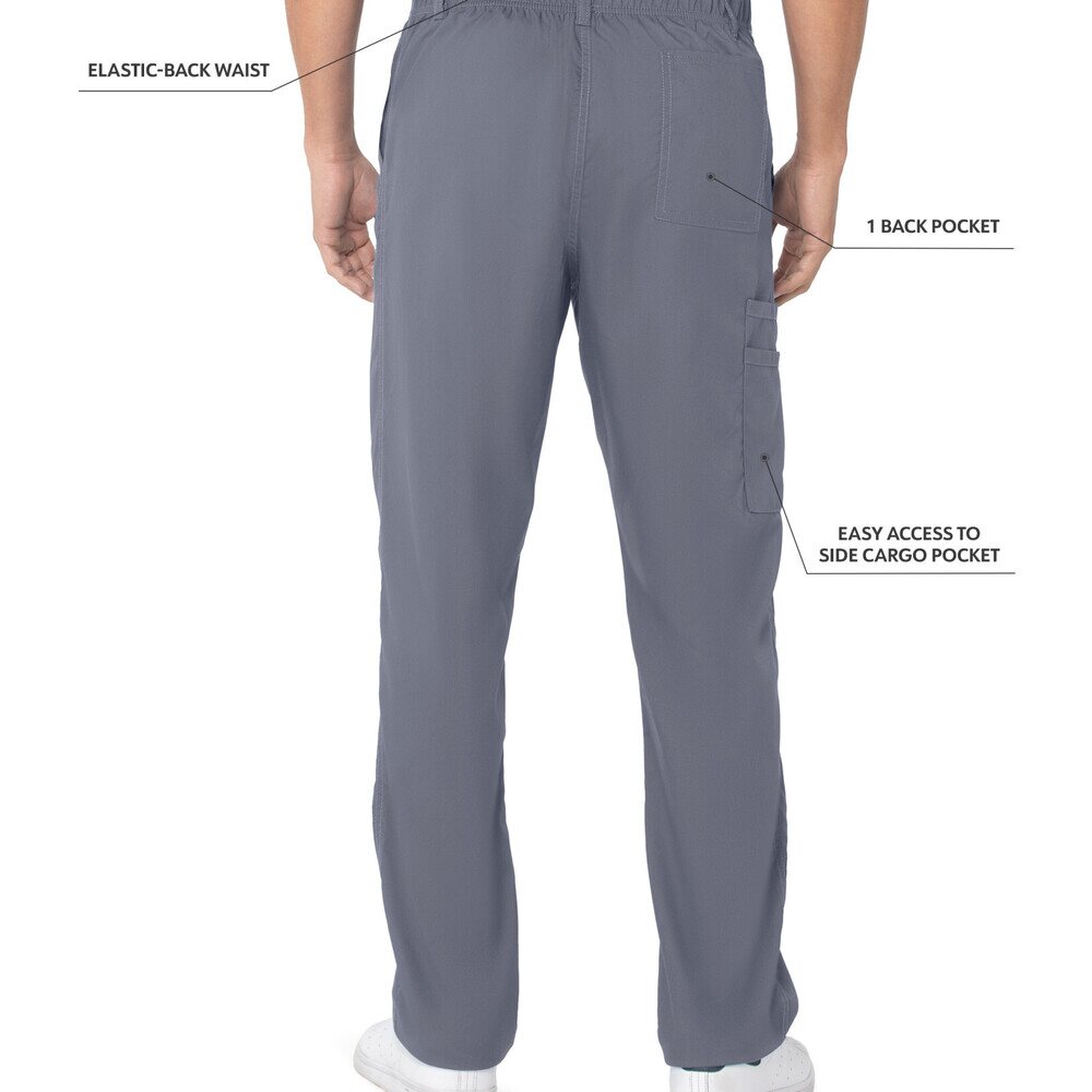 - Mid-rise 50/50 flat front, elastic back cargo scrub pant with belt loops