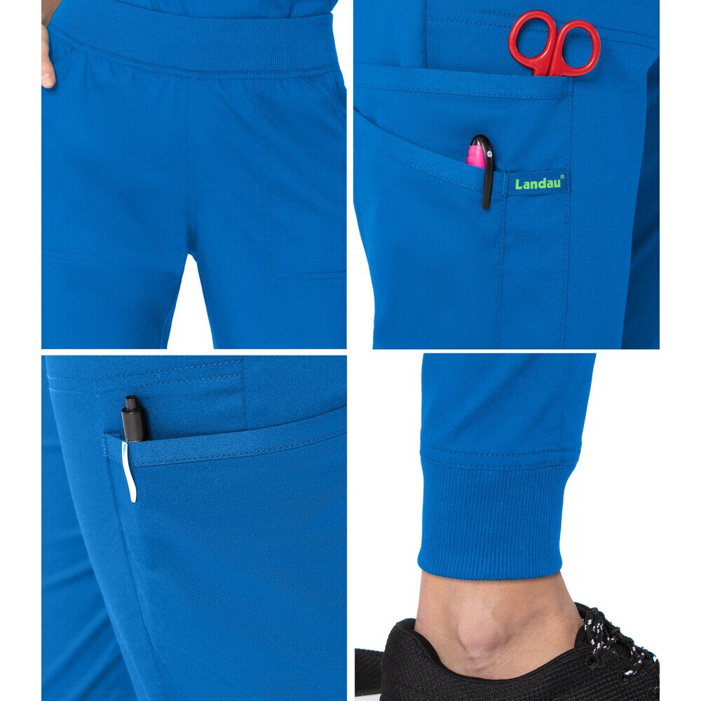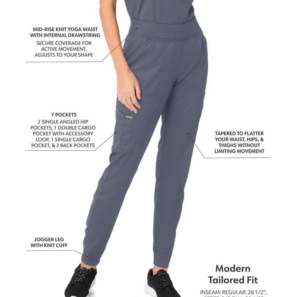 Landau Proflex Women's Banded-Bottom Jogger Pants with Elastic Waistband + 7 Pockets - WHITE / Sizes XS - 5XL. These Landau ProFlex mid-rise jogger pants for women feature an elastic waist with an internal drawstring ensuring a snug, custom fit, and seven pockets provide more than enough storage for all your essentials. Landau modern tailored fit is tapered to enhance your shape without constricting your movement, and Landau's modern 2-way comfort stretch helps give you added flexibility required of your work wear. Landau is known for producing apparel that work as hard as you do!