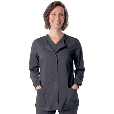 Landau Proflex Women's Snap Front Jacket - GRAPHITE / Sizes XXS - 5XL. Getting ready is a snap in this Landau Proflex crew-neck snap front jacket with beautiful back yoke detailing and a feminine cut for that crucial touch of style. Landau's modern tailored fit is tapered to enhance your shape without constricting your movement, and Landau's 2-way comfort stretch helps give you added flexibility required of your work wear. Landau is known for producing apparel that work as hard as you do! 73% Polyester/25% Rayon/2% Spandex.