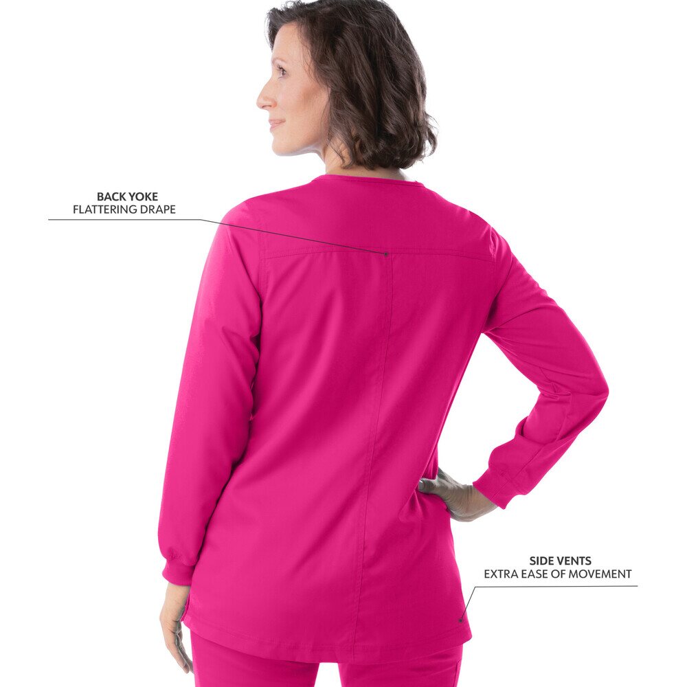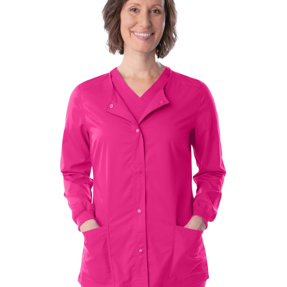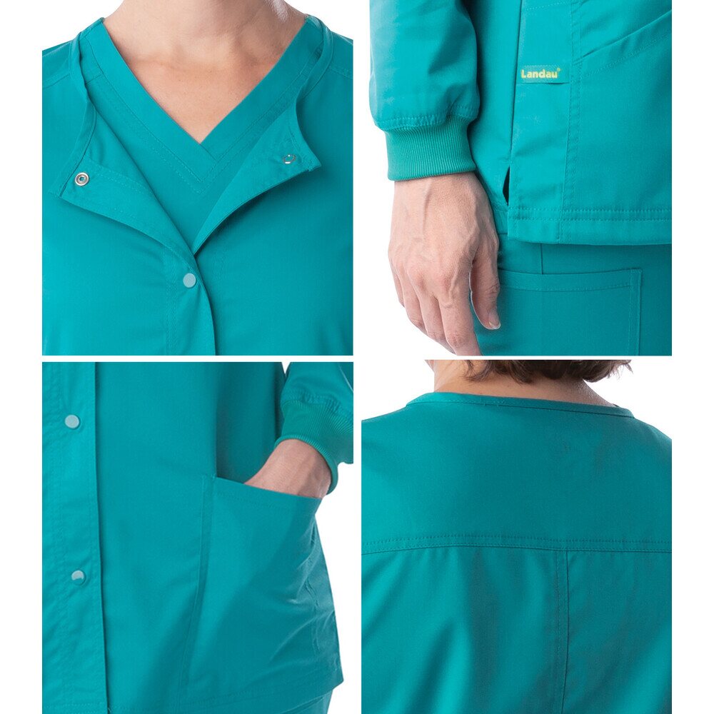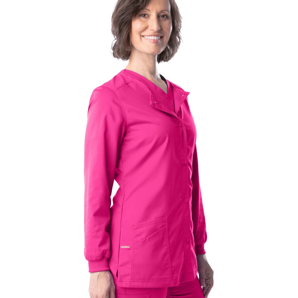 Landau Proflex Women's Snap Front Jacket - PRIMROSE / Sizes XXS - 5XL. Getting ready is a snap in this Landau Proflex crew-neck snap front jacket with beautiful back yoke detailing and a feminine cut for that crucial touch of style. Landau's modern tailored fit is tapered to enhance your shape without constricting your movement, and Landau's 2-way comfort stretch helps give you added flexibility required of your work wear. Landau is known for producing apparel that work as hard as you do! 73% Polyester/25% Rayon/2% Spandex.