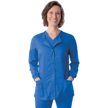 Landau Proflex Women's Snap Front Jacket - ROYAL / Sizes XXS - 5XL. Getting ready is a snap in this Landau Proflex crew-neck snap front jacket with beautiful back yoke detailing and a feminine cut for that crucial touch of style. Landau's modern tailored fit is tapered to enhance your shape without constricting your movement, and Landau's 2-way comfort stretch helps give you added flexibility required of your work wear. Landau is known for producing apparel that work as hard as you do! 73% Polyester/25% Rayon/2% Spandex.