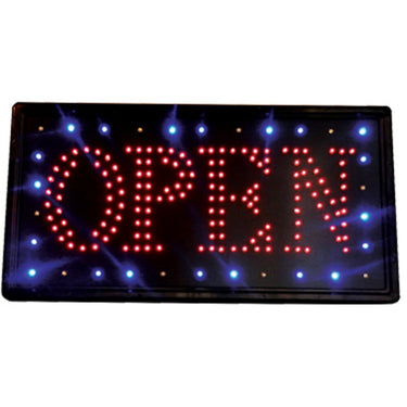 LED "OPEN" Sign. Eyecatching, animated, indoor LED sign. Lightweight and easy to install. Features a 53-1/2" power cord and two metal loops for hanging.
