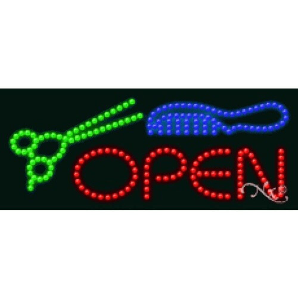 LED Sign - Hair Barber Open / 11"H x 27"W x 1"D. High impact, eye Catching, real LED sign. With a characteristic brightness that can attract customers like nothing else, virtually burning your identity into the minds of potential and future customers. LED signs can left on 24 hours a day, 7 days a week, 365 days a year. This LED sign will make a great impact on your customers. Securely packed in foam. Shipped & fully insured. 1 year Warranty.