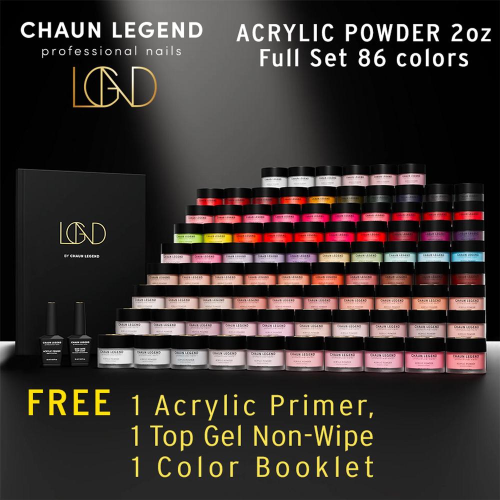 LGND Acrylic Powder 2 oz. - Full Set 86 colors, Free 1 Acrylic Primer 0.5 oz., Gel Top Non-Wipe 0.5 oz., 1 Booklet by Chaun Legend