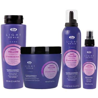 Lisap Light Scale Anti-Yellow Set - Shampoo (250 mL.) + Mask (500 mL.) + Mousse (250 mL.) + Spray (125 mL.). The Lisap Anti-Yellow Set - the perfect solution for fighting brassy tones and reviving blonde shades. This purple pigmented line is designed to neutralize yellow tones on the hair caused by pollution, weather, smoke, and natural oxidation processes. The Light Scale Care Anti-Yellow Line includes the following products: Anti-Yellow Shampoo, Anti-Yellow Mask, Anti-Yellow Mousse, and Anti-Yellow Spray. This complete set provides a comprehensive solution for all your hair care needs, from cleansing to styling and finishing.