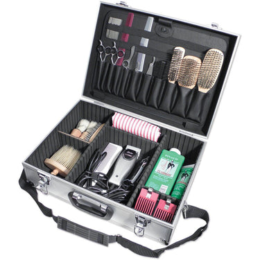 Lockable Aluminum Barber Case / 3"H x 17-3/4"W x 6"D. Lockable aluminum case features a main storage compartment with 5 adjustable dividers and an inside lid with removable tool organizer, 14 elastic loop holders and 11 pockets. Includes shoulder strap and carry handle. Textured silver finish. Measures 13"H x 17-3/4"W x 6"D.