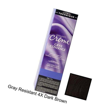 L'Oreal Excellence Creme Permanent Haircolor - Gray Resistant 4X Dark Brown / 1.74oz. L'Oreal Excellence Creme Permanent Hair color is enriched with special polymers, the conditioning agents are especially gentle to fragile, fine, dry, permanent waved and chemically relaxed hair. Make hair easy to detangle, manageable and silky to the touch. L'Oreal Excellence Creme Permanent Hair color has a unique foaming action that makes application a breeze.