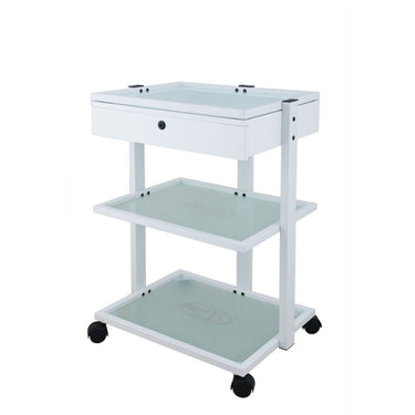 Lotta Beauty Trolley with Locking Drawer and 3 Glass Shelves. The Lotta is a super clean looking trolley with a white metal structure, locking drawer and 3 large glass shelves for instruments. The open nature of the shelves makes this rolling cart very convenient. The Lotta also has full mobility thanks to its 4 easy glide wheels.