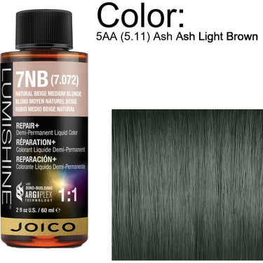 Joico LumiShine Demi Permanent Liquid Color - 5AA (5.11) Ash Ash Light Brown. When shine, tone, and condition are top priorities, Joico LumiShine Demi Permanent Liquid Color offers a versatile and gentle solution that delivers professional results with ease. This deposit-only liquid color system is ideal for clients who seek vibrant, healthy-looking hair without the commitment of permanent color or the harshness of ammonia. Whether you're glossing, glazing, toning, correcting, or blending gray, this demi-permanent color performs with precision, restoring vitality while elevating shine and softness.