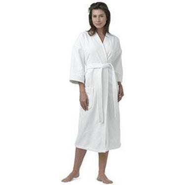 Luxury Hotel Velour Kimono Robe, White. Various textured patterns in a lightweight cotton or cotton/poly blend produce a robe that is compact, absorbent and attractive. Sizes to fit most.