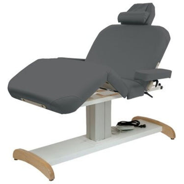 Majestic Deluxe Electric Massage and Spa Table / 30" Wide by Custom Craftworks. Sleek and modern, Custom Craftworks' Deluxe model in the Majestic Electric Massage Table line provides effortless, comfortable support in every position. Smoothly transition clients from supine to seated with the standard manually tilting back and knee sections. Its column base allows for generous leg and knee room, 12" height range adjustment and ease of operation, with just a tap of the toe. The Deluxe model includes a dual action face rest, salon head support and neck pillow, swivel side arms and rounded corners. Crescent pillow not included.