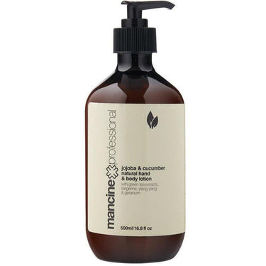 Mancine - Natural Hand & Body Lotion - Jojoba & Cucumber / 16.8 fl. oz. - 500 mL. Mancine Natural Hand & Body Lotion is specifically formulated to restore the skin's moisture balance by soothing and deeply nourishing dry skin. Mancine Natural lotion is enriched with an infusion of Shea Butter and Jojoba Oil combined with Tangerine, Geranium, Lavender and Ylang Ylang oils to hydrate the skin, providing calming relief and improving skin elasticity.