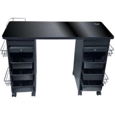 Manicure Table With Lockable Drawers & Glass Top. This sleek, glossy black manicure table with lockable drawers has a plethora of desirable features!
