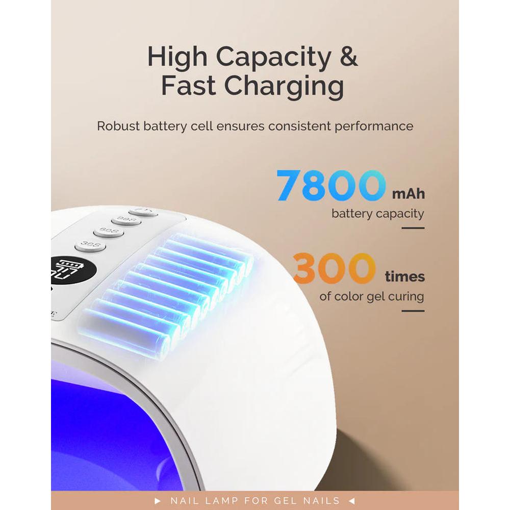 With a built-in 7800mAh rechargeable battery, this powerful UV/LED nail lamp is fully equipped to tackle the demands of both professional salons and home enthusiasts. It offers the convenience of cordless operation, giving you the freedom to move around your workspace without the restriction of cables. Once fully charged, it can cure up to 300 sessions of color gel. Its fast-charging capability ensures that you're never left waiting, making it an ideal tool for busy professionals who need to maintain efficiency throughout the day.