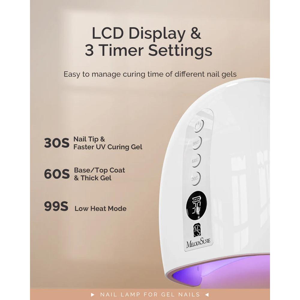 Each gel type requires different curing times, and the MelodySusie P-PLUS30G gives you full control with its 3 adjustable timer settings: 30 seconds, 60 seconds, and 99 seconds. These options ensure that you can customize the curing process to suit the specific needs of each product you use. The 99-second low heat mode is especially beneficial for clients with sensitive nails, offering a gentle, gradual heat-up to reduce any discomfort. The built-in LCD display makes it easy to monitor the curing process, and you can quickly check the battery level, so you're never caught off guard.