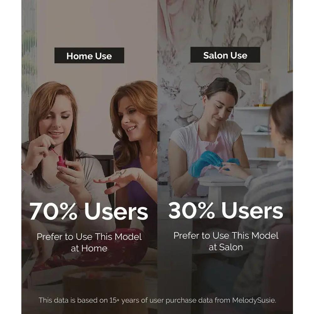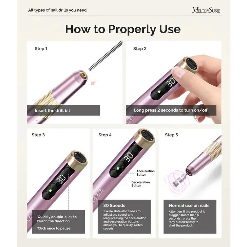 With 30 adjustable speed levels, the MelodySusie PM180G Nail Drill offers exceptional versatility. From gentle filing to heavy-duty sanding, you can fine-tune the speed to suit your specific needs, ensuring optimal performance for every task. The easy-to-read LCD display shows the current speed, helping you stay in control and make adjustments as necessary. Whether you're a novice or an expert, the intuitive design of the PM180G makes it easy to operate and customize your nail care routine.