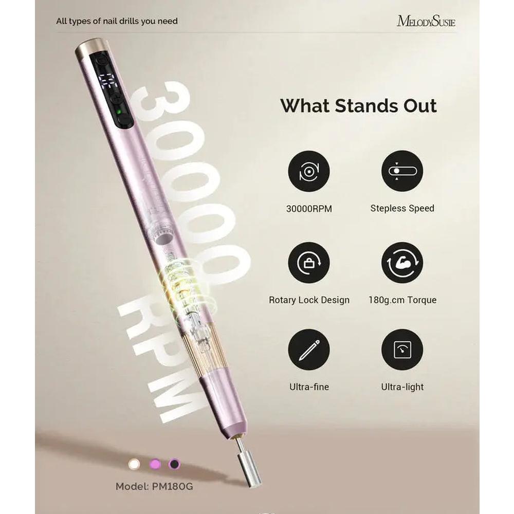 Crafted with the needs of professionals and enthusiasts in mind, the MelodySusie Rechargeable 30000RPM Nail Drill is an investment that brings convenience, precision, and high performance to your nail care routine. From its enhanced stability and quiet motor to its portable design and customizable speed settings, this tool is the ultimate companion for flawless nail artistry. Whether you are operating a busy salon or offering retail products to your clients, the PM180G Nail Drill will elevate the quality of your service and satisfaction. Its more than just a tool; its a game-changer for your nail care experience.