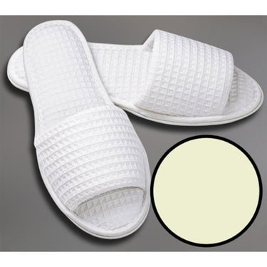 Men's Open Toe Waffle Slippers in Ecru. Elevate your spa or salon experience with the Men's Open Toe Waffle Slippers by Boca Terry. Designed for comfort and durability, these slippers provide the perfect combination of luxury and practicality, ensuring your clients feel pampered from the moment they step in. The elegant waffle pattern and ecru color deliver an upscale look, while their functional design guarantees satisfaction for both your clients and your business needs.