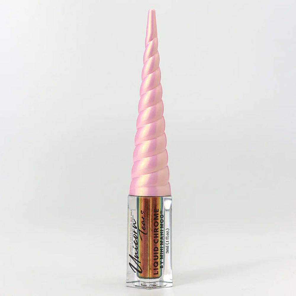 Mini Mani Moo! Unicorn Tears Liquid Chrome - Chestnut Forest 0.1 oz. Transform your beauty routine with the enchanting allure of the Mini Mani Moo! Unicorn Tears Liquid Chrome in Chestnut Forest. This mesmerizing product offers a touch of magic that is as versatile as it is captivating. Whether you're looking to add a sparkling edge to your nails, enhance your eyes with a chrome finish, or create a bold lip statement, this liquid chrome formula provides a multi-dimensional effect that draws attention in all the right ways. Available in a beautiful, deep chestnut hue, this formula is a must-have for any professional seeking to elevate their clients look to a whole new level.
