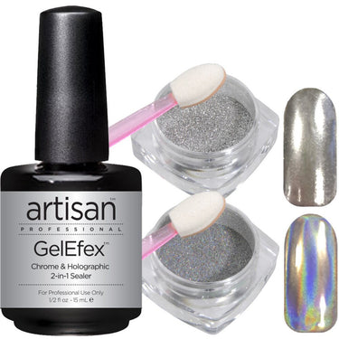 - Included: Holographic powder (approx. 2 g), mirror chrome powder (approx. 2 g), Artisan Chrome & Holographic 2-in-1 Top & Base Coat (0.5 oz), and 2 sponge applicators.