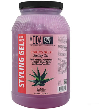 Moda Aloe Vera Styling Gel - Strong Hold / 1 Gallon - 128 oz. Styling Gel Strong Hold. HAIR STYLING GEL STRONG HOLD is formulated with Aloe Vera to provide a long-lasting shiny strong hold while conditioning and nourishing the hair. For dry and brittle hair. Our Strong Hold formula is perfect for creating daring styles that defy gravity. It stays put and dries clear, leaving no white residue.