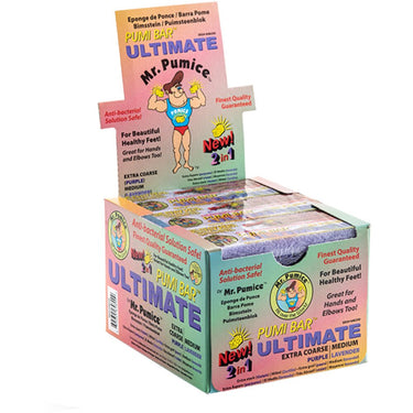 Mr. Pumice Ultimate Pumi Bar / 12 Piece Display. Mr. Pumice Ultimate Pumi Bar, 12 Piece Display. The Mr. Pumice Ultimate Pumice Bar is a two sided bar with both a coarse and extra coarse side. Use around toes and on soles of feet to remove calluses. Helps you achieve beautiful healthy feet. Great for elbows and hands.