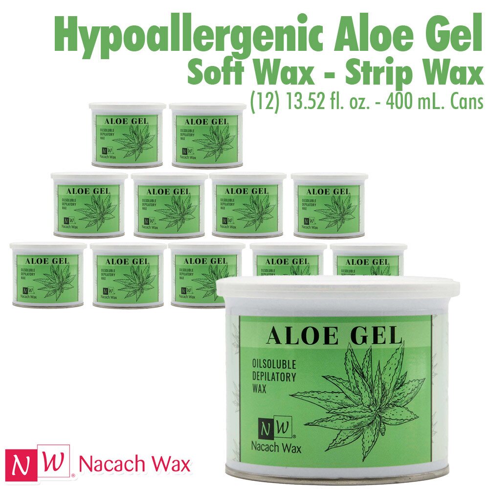 Nacach Wax - Hypoallergenic Aloe Gel Soft Wax - Strip Wax / (12) 13.52 fl. oz. - 400 mL. Cans. Our Aloe Gel Soft Wax is made with the highest-quality hypoallergenic resins and natural aloe extracts. The ingredients in this soft wax have been carefully selected to soothe the skin in order to prevent redness. Our Aloe Gel formula, transparent green in color and with a low melting point, is perfect for estheticians looking to provide their clients with a soothing soft wax hair removal experience.