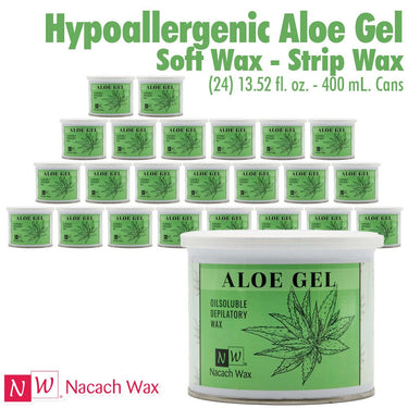 Nacach Wax - Hypoallergenic Aloe Gel Soft Wax - Strip Wax / (24) 13.52 fl. oz. - 400 mL. Cans. Our Aloe Gel Soft Wax is made with the highest-quality hypoallergenic resins and natural aloe extracts. The ingredients in this soft wax have been carefully selected to soothe the skin in order to prevent redness. Our Aloe Gel formula, transparent green in color and with a low melting point, is perfect for estheticians looking to provide their clients with a soothing soft wax hair removal experience.