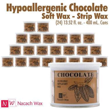 Nacach Wax - Hypoallergenic Chocolate Soft Wax - Strip Wax / (24) 13.52 fl. oz. - 400 mL. Cans. With a creamy texture and sweet chocolate scent, this low-temperature formula was developed to make soft wax hair removal a more pleasant experience for your clients. Our Hypoallergenic Chocolate Soft Wax is made with high-quality hypoallergenic resins and titanium dioxide, which is the perfect combination to prevent any irritation.