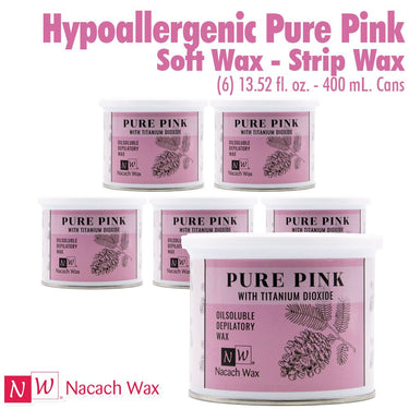 Nacach Wax - Hypoallergenic Pure Pink with Titanium Dioxide Soft Wax - Strip Wax / (6) 13.52 fl. oz. - 400 mL. Cans. Our Pure Pink Soft Wax has been formulated with the best hypoallergenic raw materials and titanium dioxide. It has a creamy consistency as well as an attractive fruity scent. It has a low melting point, this type is excellent for sensitive skin, all areas of the body, and hair types. Just give it a try and your customers will instantly notice the superior quality differences and a comfortable temperature at body contact.