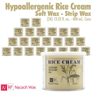 Nacach Wax - Hypoallergenic Rice Cream Soft Wax - Strip Wax / (24) 13.52 fl. oz. - 400 mL. Cans. Nacach Rice Cream Soft Wax is a highly tested proven formula in the Italian market made with the finest hypoallergenic resins and enriched with zinc oxide, which is known for its natural anti-irritation properties. Easy to apply and with a low melting point, this rice cream soft wax was designed to offer estheticians the perfect waxing tool to provide their clients with a complete and soothing waxing experience.