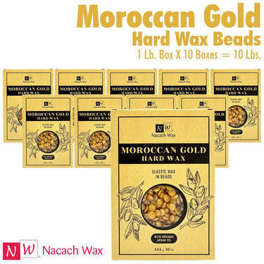 Nacach Wax - Moroccan Gold Hard Wax Beads with Argan Oil / 10 Lbs. This new and improved version of our Ocean Blue is good for all skin types and all parts of the body. Recommended for Brazilians, Bikini areas, and hair that is very thick. Maroccan Gold providings great results for customers with dry skin because of Argan Oil's hydrating properties, which makes their skin feel soft and silky soft afterward.