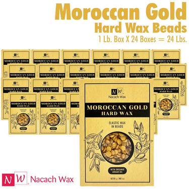 Nacach Wax - Moroccan Gold Hard Wax Beads with Argan Oil / 24 Lbs. This new and improved version of our Ocean Blue is good for all skin types and all parts of the body. Recommended for Brazilians, Bikini areas, and hair that is very thick. Maroccan Gold providings great results for customers with dry skin because of Argan Oil's hydrating properties, which makes their skin feel soft and silky soft afterward.