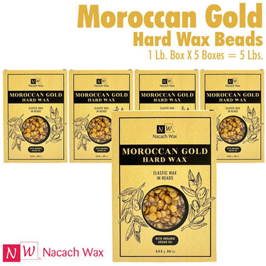 Nacach Wax - Moroccan Gold Hard Wax Beads with Argan Oil / 5 Lbs. This new and improved version of our Ocean Blue is good for all skin types and all parts of the body. Recommended for Brazilians, Bikini areas, and hair that is very thick. Maroccan Gold providings great results for customers with dry skin because of Argan Oil's hydrating properties, which makes their skin feel soft and silky soft afterward.