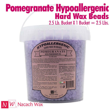 Nacach Wax - Pomegranate Hypoallergenic Hard Wax Beads / 2.5 Lbs. Bucket. This truly innovative Multidirectional hair removal transparent hard wax is ideal for coarse-hair, full-body waxing, having a medium drying time (less than 10 seconds). Enriched with pomegranate oil, this type of hypoallergenic hard wax carries anti-inflammatory, antioxidant, soothing, and regenerative properties; not to mention an amazing aroma that will fill the room. Highly recommended for large areas of the body. Our hypoallergenic waxes are Colophonium Free.