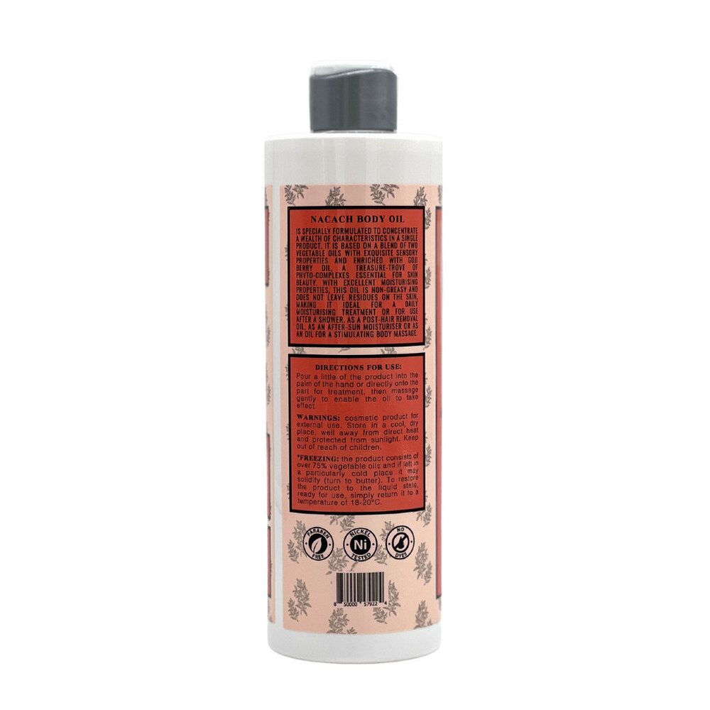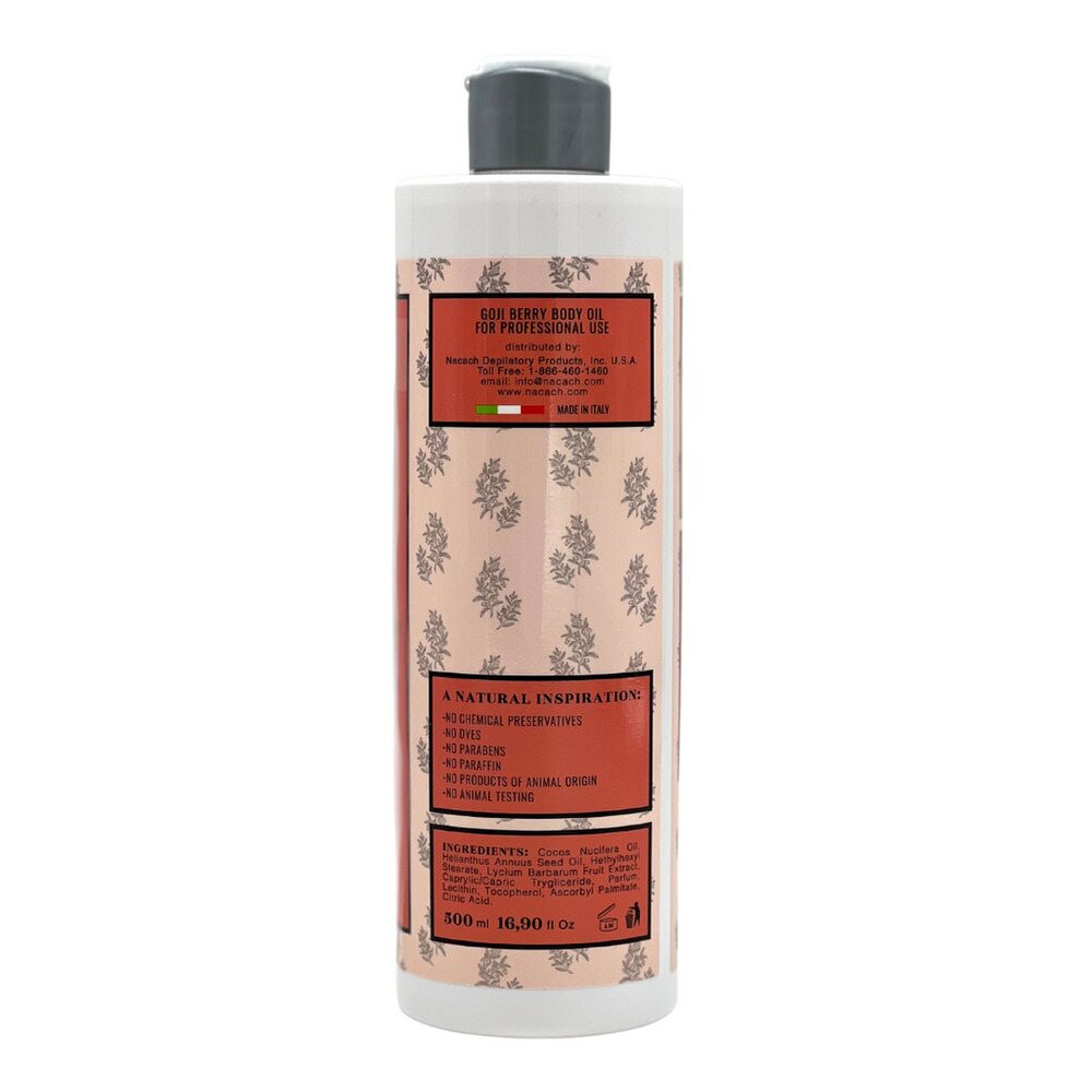Nacach Wax - Post Wax Goji Berry Body Oil / 16.9 fl. oz. - 500 mL. The Goji Berry Body Oil is enriched with exquisite sensory properties that consist of a mixture between the Goji berry Oil and two vegetable oils. Its moisturizing properties provide customers with the best post-hair removal experience. We highly recommend this product for clients that want to provide their customers with a high-end quality service. This oil is not greasy and does not leave residues on the skin, making it ideal not only for post-waxing but also for after a shower or for a stimulating body massage. No parabens, paraffin, dyes, or chemical preservatives, our Goji Berry Body Oil will make a great addition to any professionals waxing supplies.