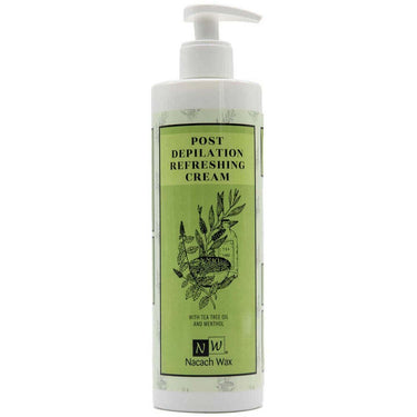 Nacach Wax - Post Wax Refreshing Cream / 16.9 fl. oz. - 500 mL. Our Post-Wax Refreshing Cream presents a creamy consistency that contains tea tree oil and menthol which provides a pleasantly cool sensation because of its refreshing and decongestant properties. Produced with a unique paraben-free formula, our post depilation cream soothes the skin after waxing. This refreshing cream contains natural tea tree oil and menthol, which are known for their antiseptic and decongestant properties, respectively. Thanks to these natural properties, it will leave your clients skin pleasantly soft and moisturized.