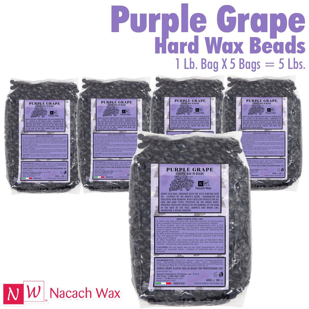 Nacach Wax - Purple Grape Hard Wax Beads / 5 Lbs. Professional Purple Hard Wax Beads. Our best-selling Purple Grape Hard Wax Beads are enriched with a sweet grape scent and Vitis Vinifera Seed Oil, which is known for its potent antioxidant properties. With high elasticity and a low melting point, our Purple Grape Hard Wax is ideal for estheticians looking to remove both fine and coarse hairs on all areas of their client's bodies.