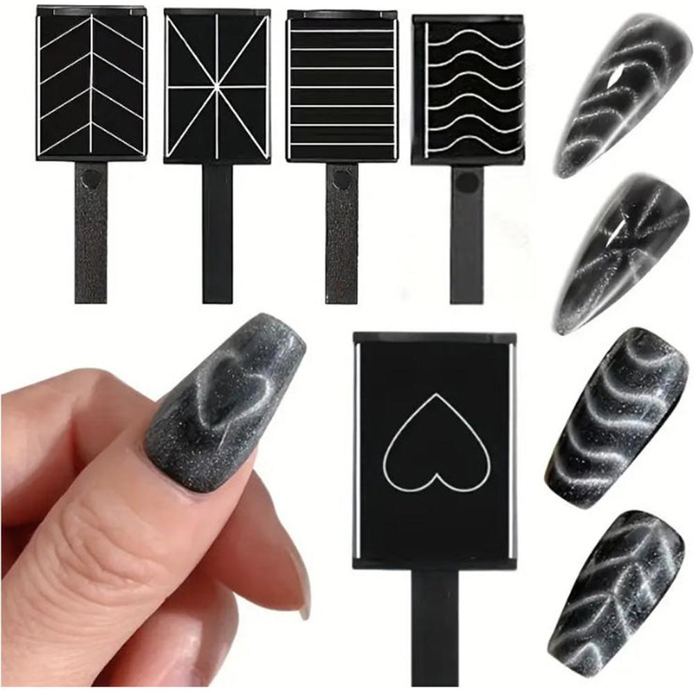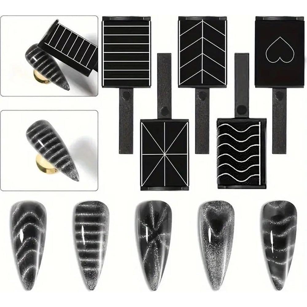 Nail Art - Magnetic Cat Eye 5 Piece Kit. Transform your nail art creations into stunning masterpieces with the Nail Art Magnetic Cat Eye 5 Piece Kit. This professional-grade set is specifically designed to work with cat eye gel polish, enabling you to effortlessly create mesmerizing swirls, stripes, and even 3D heart effects. The dual-ended tools are crafted for precision, allowing beauty professionals to achieve intricate and flawless designs. Whether you're a seasoned nail technician or a beginner, this versatile kit will help elevate your manicure offerings and impress your clients.
