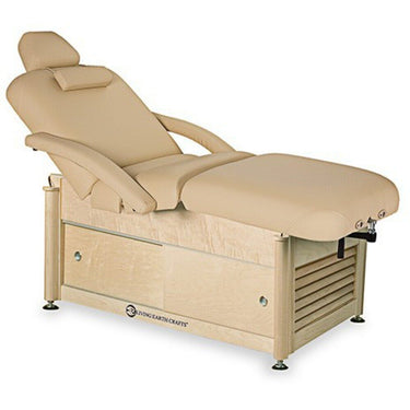 Napa Salon Treatment Table Cabinet Base with PowerAssist™ by Living Earth Crafts. The Napa Salon spa treatment table enables resorts to offer a full range of spa services virtually anyplace where power is not readily available. Smooth, quiet height adjustments are easily accomplished with the client on the table, with only a few revolutions of the sturdy fold-away handle. The versatile Napa Salon with its non-electric PowerAssist tilt option offers limitless possibilities at an incredible value. Using the One Touch lever, a technician may adjust both the back and leg tilts to the perfect angle, infinite adjustability. Adjustments can be made with the client on the table, allowing you to provide massage, facials, manicures, and more Its simple, elegant hardwood design will enhance any treatment room. Shown with optional Flex Arms, Neck Roll and Salon Headrest.