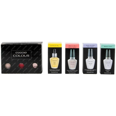 Natural Nail Essentials Kit. Save Time & Money with Kits! This collection offers all of the color and treatment essentials you need to offer manicure and pedicure services. It features Cuccio Colour Professional Nail Lacquer, which is formulated with Triple Pigmentation Technology for rich coverage in one coat and true coverage in two coats. It also fills nail imperfections, self-levels, and dries quickly between coats. For smooth and easy application, its flat stem brush contains over 600 DuPont nylon filament bristles. Vegan and contains no DBP or toluene.