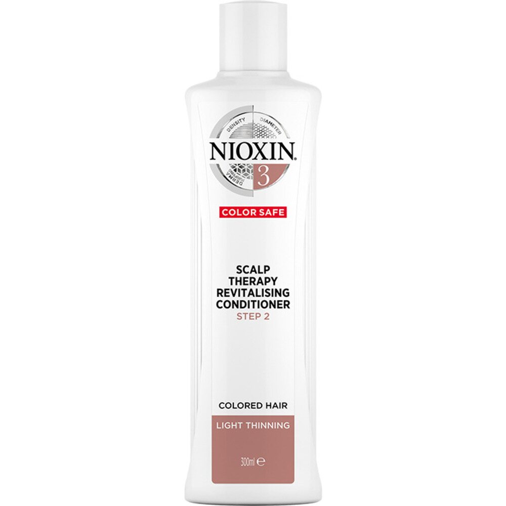 Nioxin Scalp Therapy Revitalizing Conditioner - STEP 2 - System 3 / For Colored Treated Hair with Light Thinning / 10.1 oz. - 300 mL. Strengthen and moisturize hair with Nioxin's three part System 3 Scalp Therapy Conditioner for Colored Hair with Light Thinning. This density-protecting professional hair care product with BioAmp technology helps retain moisture balance, providing hair resilience. Lightweight, Nioxin conditioner is specially designed for colored hair with light thinning and leaves it thicker, fuller-looking. Nioxin's Scalp Therapy Conditioner is the second step of a three part Nioxin regimen, designed to strengthen the hair and amplify hair structure. Helps remove follicle-clogging sebum, fatty acids and other environmental residues.