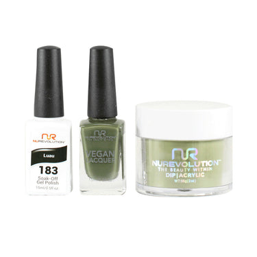 NR Elite Trio: Gel Polish + Lacquer + Dip/Acrylic Powder - #MS183 Luau by NuRevolution / Gel Polish 15 mL. + Lacquer 15 mL. + Dip/Acrylic 2 oz. by NuRevolution. Experience the best in nail care with NuRevolution Elite Trio! Our set includes the finest dip/acrylic powder, gel polish, and vegan lacquer for complete and professional services. Each trio comes with a 15ml soak-off gel polish, a 15ml vegan lacquer, and a 2oz dip/acrylic powder. Upgrade your nail salon or spa with NR Elite Trio and offer your clients the ultimate nail care experience.