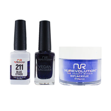 NR Elite Trio: Gel Polish + Lacquer + Dip/Acrylic Powder - #MS211 Blue Esther by NuRevolution / Gel Polish 15 mL. + Lacquer 15 mL. + Dip/Acrylic 2 oz. by NuRevolution. Experience the best in nail care with NuRevolution Elite Trio! Our set includes the finest dip/acrylic powder, gel polish, and vegan lacquer for complete and professional services. Each trio comes with a 15ml soak-off gel polish, a 15ml vegan lacquer, and a 2oz dip/acrylic powder. Upgrade your nail salon or spa with NR Elite Trio and offer your clients the ultimate nail care experience.