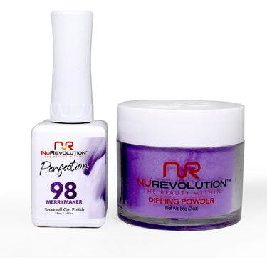 NR Perfection Set: Gel Polish + Dip/Acrylic Powder - #PFS098 Merrymaker by NuRevolution / 15 mL. Gel Polish + 2 oz. Dip/Acrylic Powder by NuRevolution. The Perfection Line is the highest quality for professional use. Easy to apply. Strong & Long lasting. The finest Dipping Powder & the most solid and bold Gel Polish.