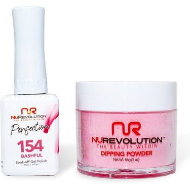 NR Perfection Set: Gel Polish + Dip/Acrylic Powder - #PFS154 Bashful by NuRevolution / 15 mL. Gel Polish + 2 oz. Dip/Acrylic Powder by NuRevolution. The Perfection Line is the highest quality for professional use. Easy to apply. Strong & Long lasting. The finest Dipping Powder & the most solid and bold Gel Polish.
