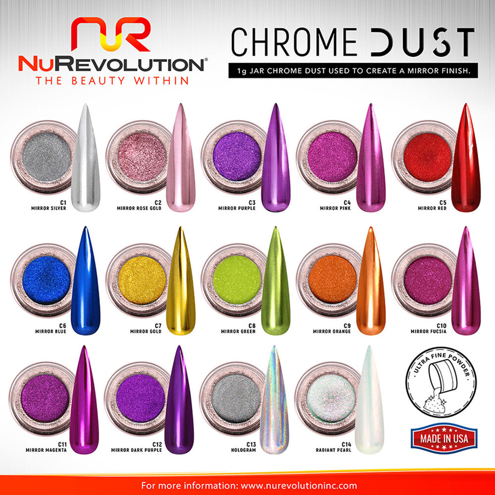 NuRevolution Chrome Dust - Nail Art - #14 Pearl / 1 Gram Jar by NuRevolution. Get ready to take your nail art to the next level with NR Chrome Dust. NuRevolution's 1 gram jar of ultra-fine, ultra-pigmented powder creates a flawless mirror finish, perfect for adding that extra touch of glamour to your client's nails. The easy-to-use formula ensures a seamless application every time, resulting in a stunning shine that will leave your clients in awe.