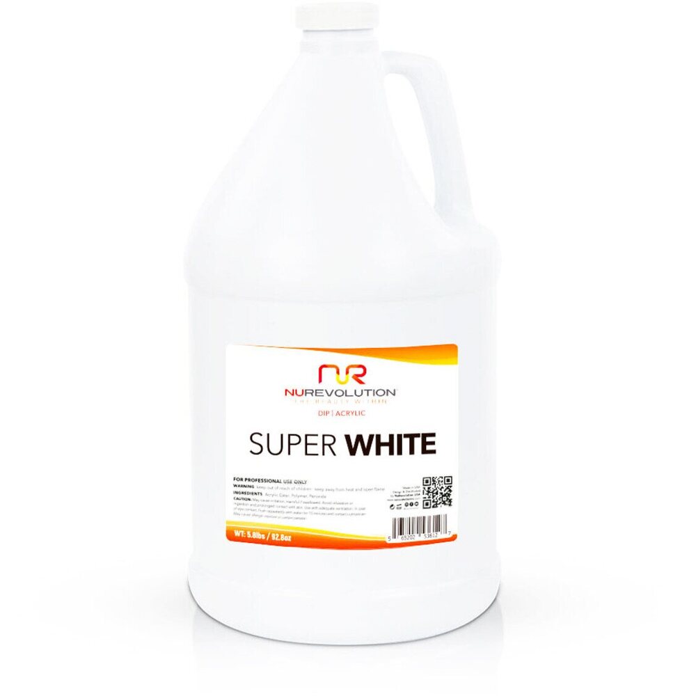 NuRevolution Dip/Acrylic Powder - Super White # / 128 oz. - 1 Gallon by NuRevolution. Improve your nail services with NuRevolution Dip Powder! Our formula is designed for an effortless, quick, and seamless application, reducing the need for filing and buffing. It also soaks off in just 10 minutes, making it convenient for your clients. In addition, our dip powder is available in both gel polish and vegan lacquer options in a variety of colors. It can be used for both acrylic and dip applications. Plus, it's made in the USA, ensuring top-quality ingredients. Upgrade your nail salon or spa with NuRevolution Dip Powder today! Available in 2 oz., 16 oz. and 128 oz. (1 Gallon) sizes!